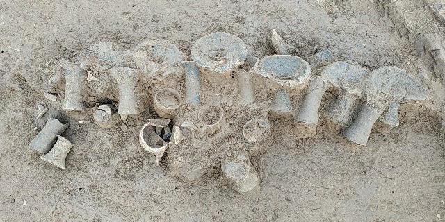 - 图为河南叶县余庄遗址标号为T0405的探方出土的陶器,该组陶器摆放有序,呈现出鲜明的礼制色彩(11月3日摄)。新华社发(河南省文物考古研究院供图)