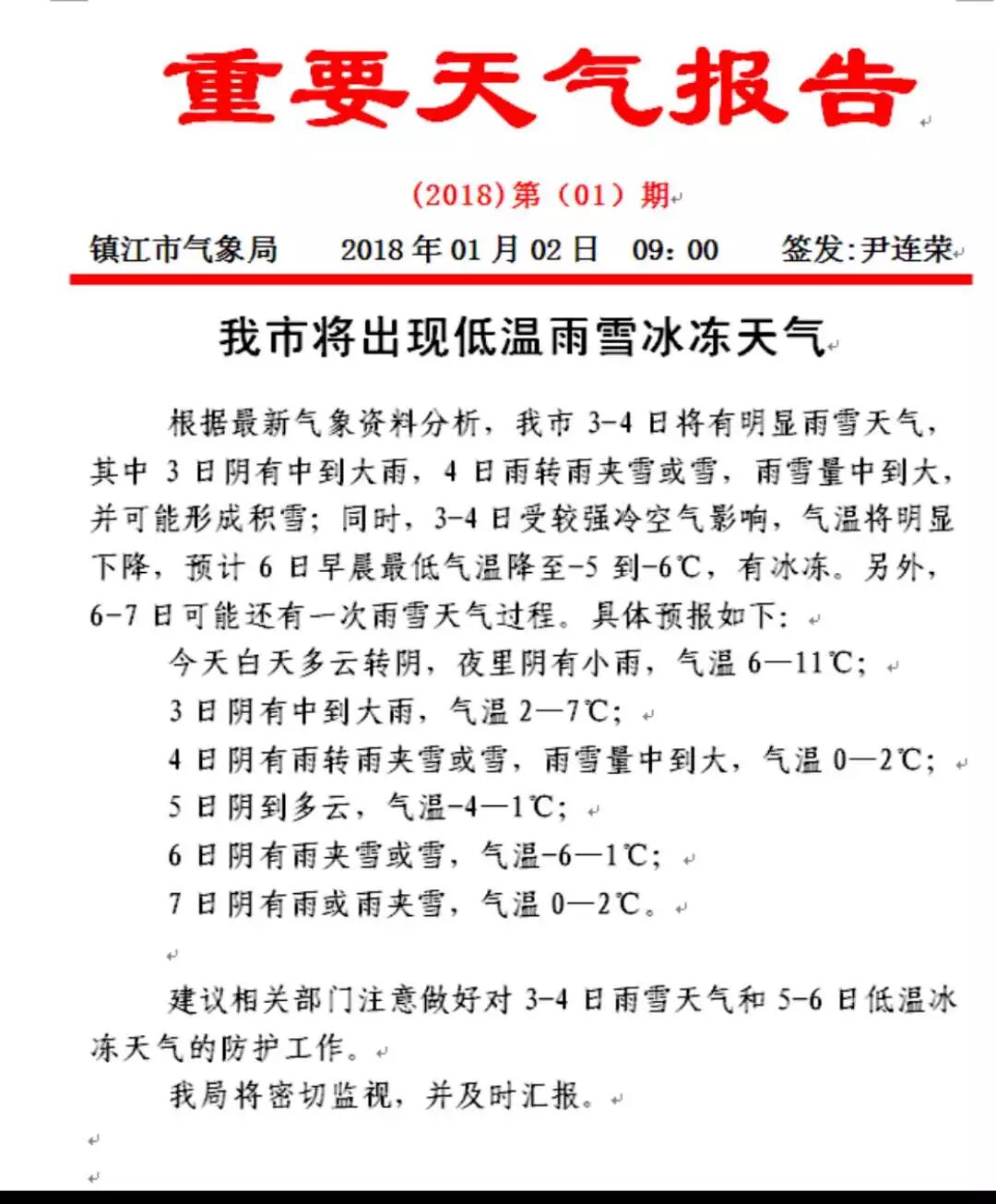 镇江市气象局1月2日09时发布重要天气报告