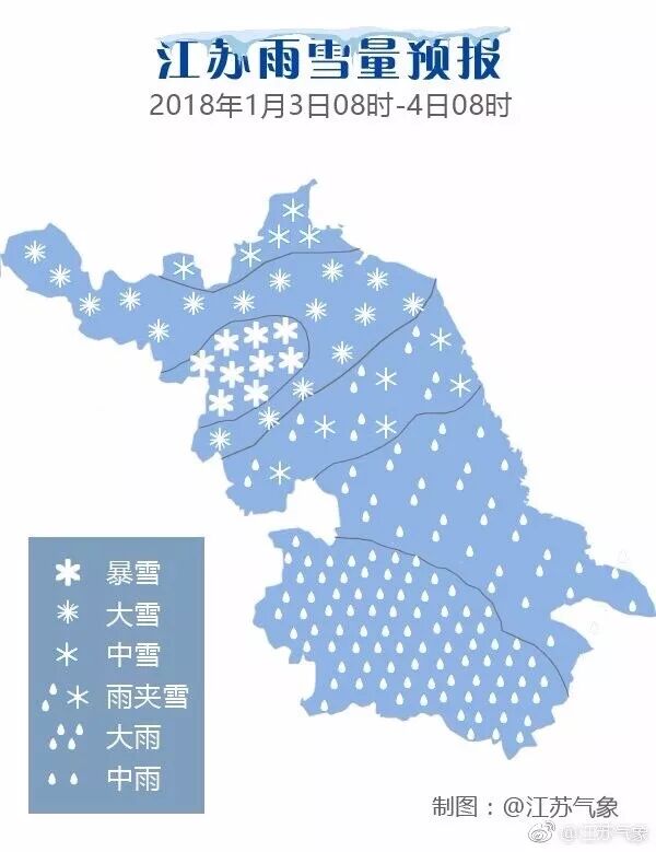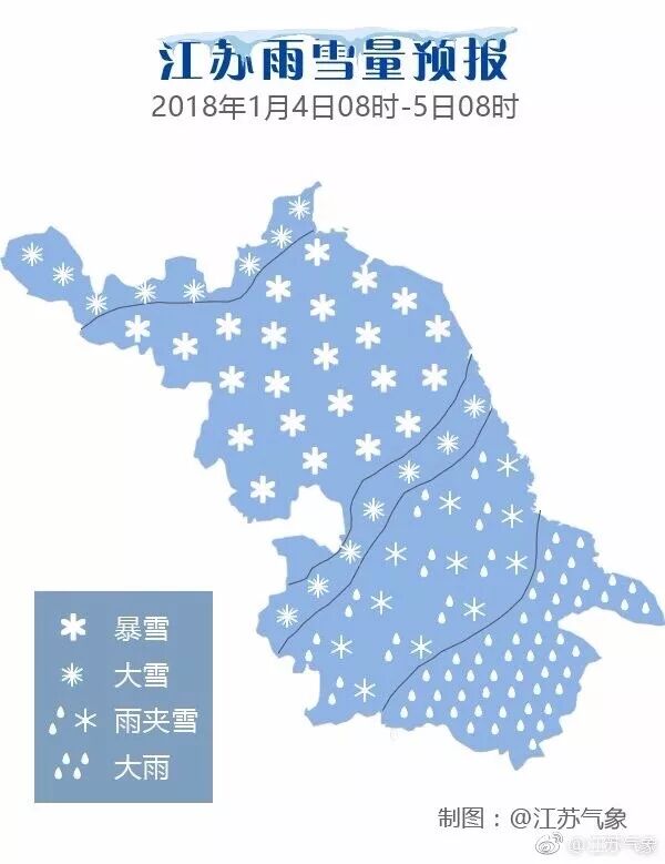 据微博@江苏气象预报,今天沿淮和淮北地区白天阴转小雨或雨夹雪,傍晚前后到夜里转中到大雪,局部暴雪,其它地区以降雨为主,雨量中到大。
