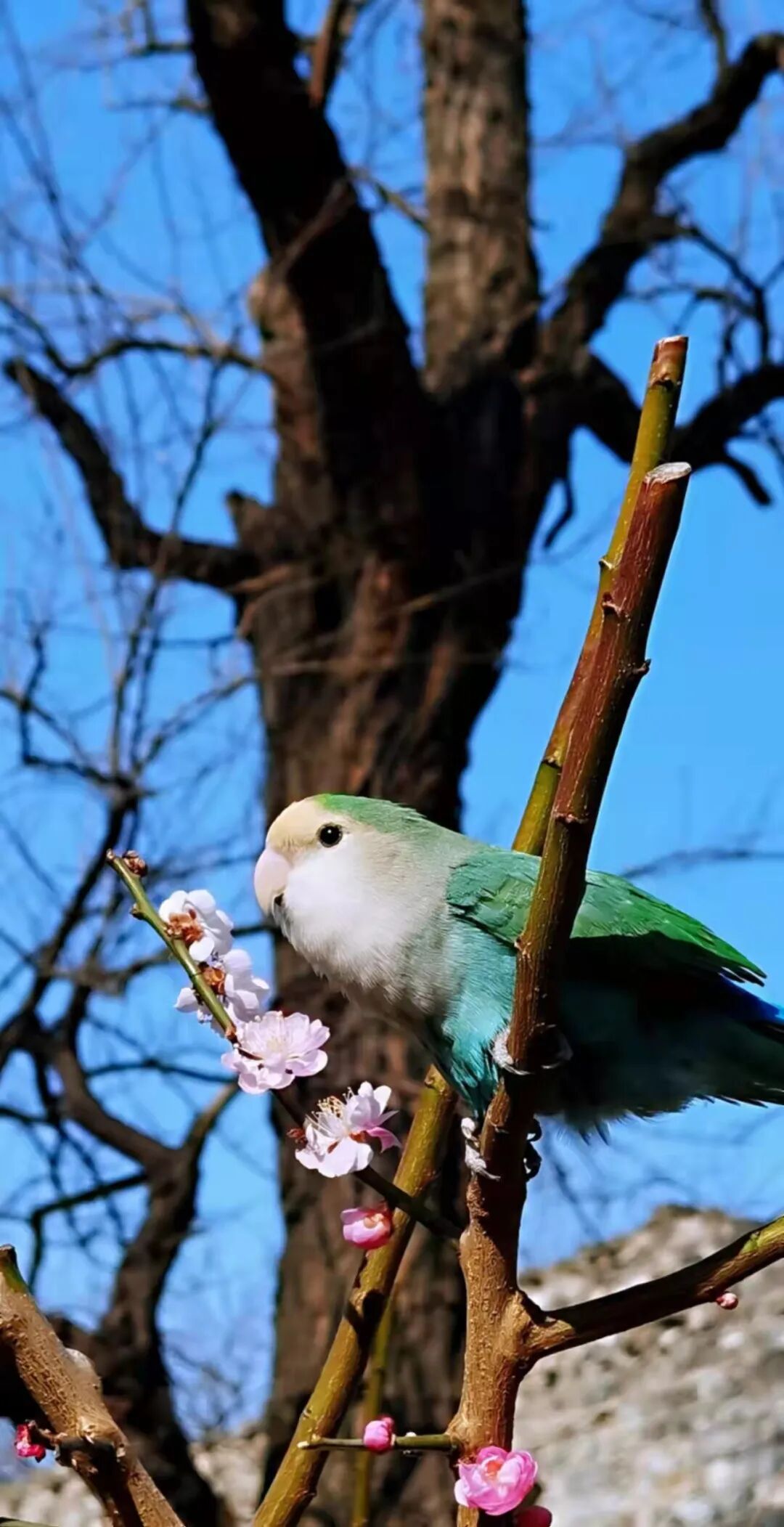 ▲3月3日,北京阳光明媚,明城墙遗址公园的梅花刚刚开放就吸引了许多游人驻足拍照,一只牡丹鹦鹉也飞上树枝来赏梅。北京/焦国春 摄(华为 P40 pro+)
