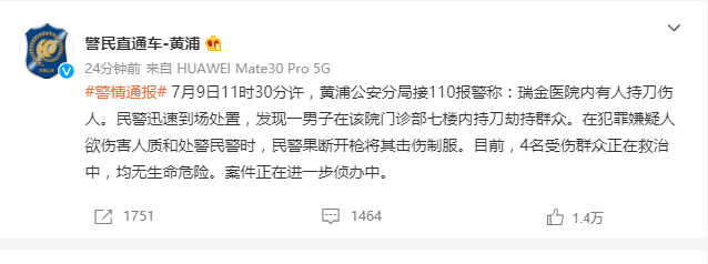 7月9日11时30分许,黄浦公安分局接110报警称:瑞金医院内有人持刀伤人。民警迅速到场处置,发现一男子在该院门诊部七楼内持刀劫持群众。在犯罪嫌疑人欲伤害人质和处警民警时,民警果断开枪将其击伤制服。目前,4名受伤群众正在救治中,均无生命危险。案件正在进一步侦办中。