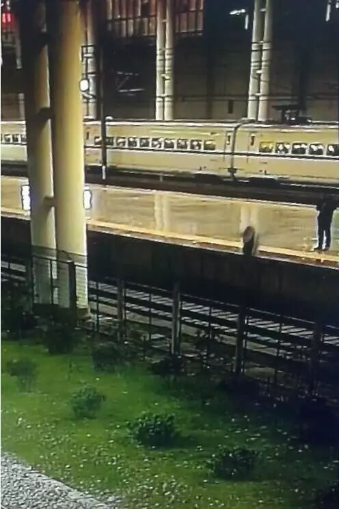 G7067 次列车从南京开往上海,当晚到达镇江站的时间是晚上 8 点 05 分左右,在列车进站过程中,一名男子不断朝来车方向观望,并在列车到达他面前的前几秒钟,做出了跳下站台的准备动作,最终,在车头即将从他面前经过的瞬间,他跳入了轨道区域。