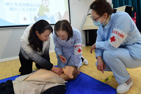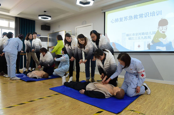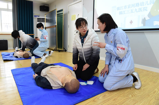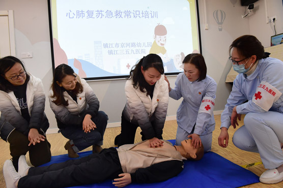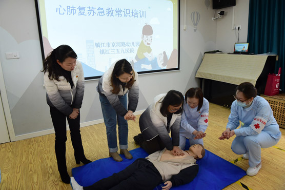 - 2023年2月24日,镇江市京河路幼儿园邀请三五九医院的医护人员来园,为教师开展“心肺复苏急救常识培训”,为教师讲解止血包扎、骨折固定、徒手心肺复苏术等急救技能,提高老师应对突发情况的救护能力,为儿童生命安全保驾护航。全媒体记者 王呈 通讯员 仇霞 马家乐 摄影报道